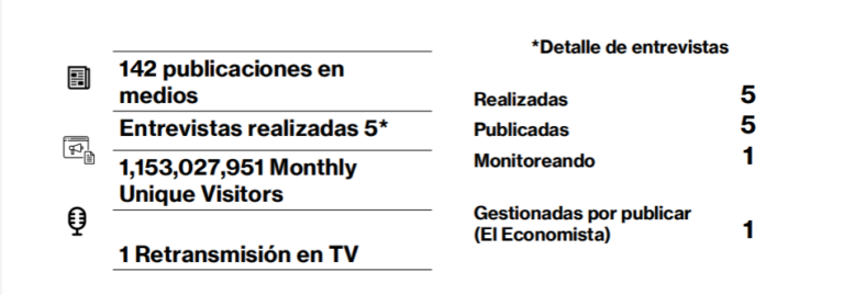 Se ha logrado ampliar de manera significativa la visibilidad y el posicionamiento de la compañía, consolidando su presencia en el ecosistema mediático y fortaleciendo su proyección pública. Este avance se traduce en la consecución de un perfil de medios amplio, diverso y alineado con los objetivos estratégicos de la organización, que incluye tanto medios generalistas como especializados, lo que ha contribuido a reforzar la reputación corporativa, incrementar el reconocimiento de marca y mejorar la percepción de los mensajes clave entre los distintos públicos de interés.